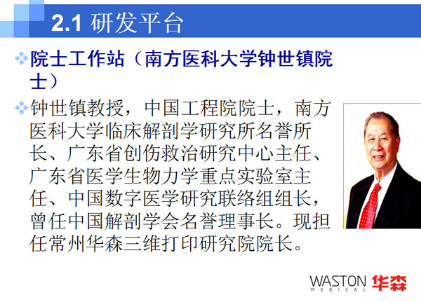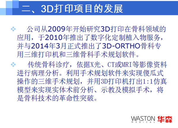 2010年:總額為兩千萬人民幣的二期設備投資已經(jīng)完成,其中包括更多的五軸加工中心、縱切機床、車削中心、慢走絲線切割等;與眾多醫(yī)學、材料學、力學等方面的專家以及多家科研機構(gòu)合作成立常州華森醫(yī)療科技有限公司;華森全球首發(fā)的專利“數(shù)字化定制植入物”經(jīng)過幾年攻關(guān)正式推向市場。
