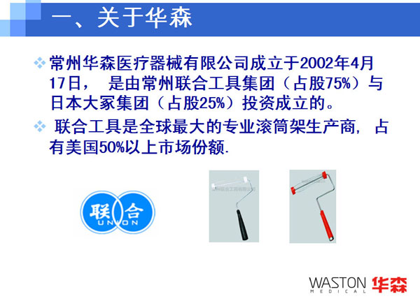 2001年:常州聯(lián)合工具集團與日本オーテー株式會社在國家級常州高新技術(shù)區(qū)發(fā)區(qū)合資成立常州華森醫(yī)療器械有限公司,開始涉足醫(yī)療產(chǎn)業(yè),為集團產(chǎn)業(yè)多元化奠定基礎;