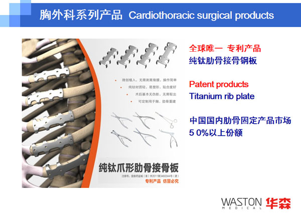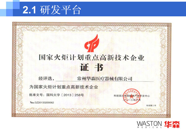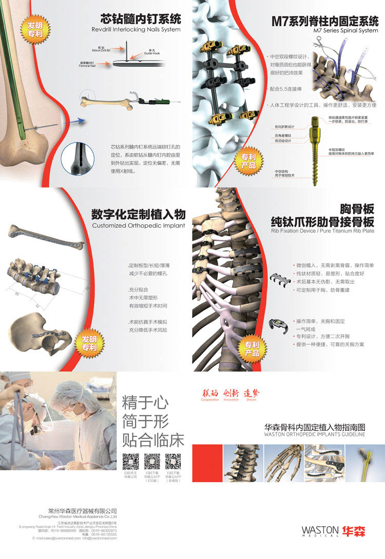 2009年:華森產(chǎn)品已經(jīng)覆蓋整個中國市場,建立起了一支由七大區(qū)域服務中心和兩百多家經(jīng)銷商組成的銷售服務網(wǎng)絡;自有品牌WASTON骨科產(chǎn)品和吻合器產(chǎn)品已經(jīng)進入30多個國家和地區(qū),特別是WASTON吻合器已經(jīng)進入歐洲十多個發(fā)達國家;在OEM市場,華森已與包括全球前五位的獨立脊柱產(chǎn)品企業(yè)在內(nèi)的三十多家企業(yè)建立了合作生產(chǎn)關(guān)系;與海歸博士團隊合作成立的常州華森生物科技有限公司正式成立;華森科技創(chuàng)新中心,即華森“三家聯(lián)動 科技創(chuàng)新”合作平臺正式成立;