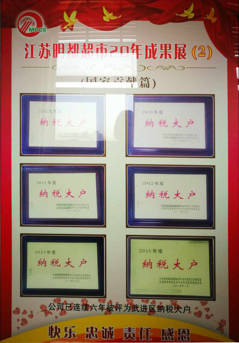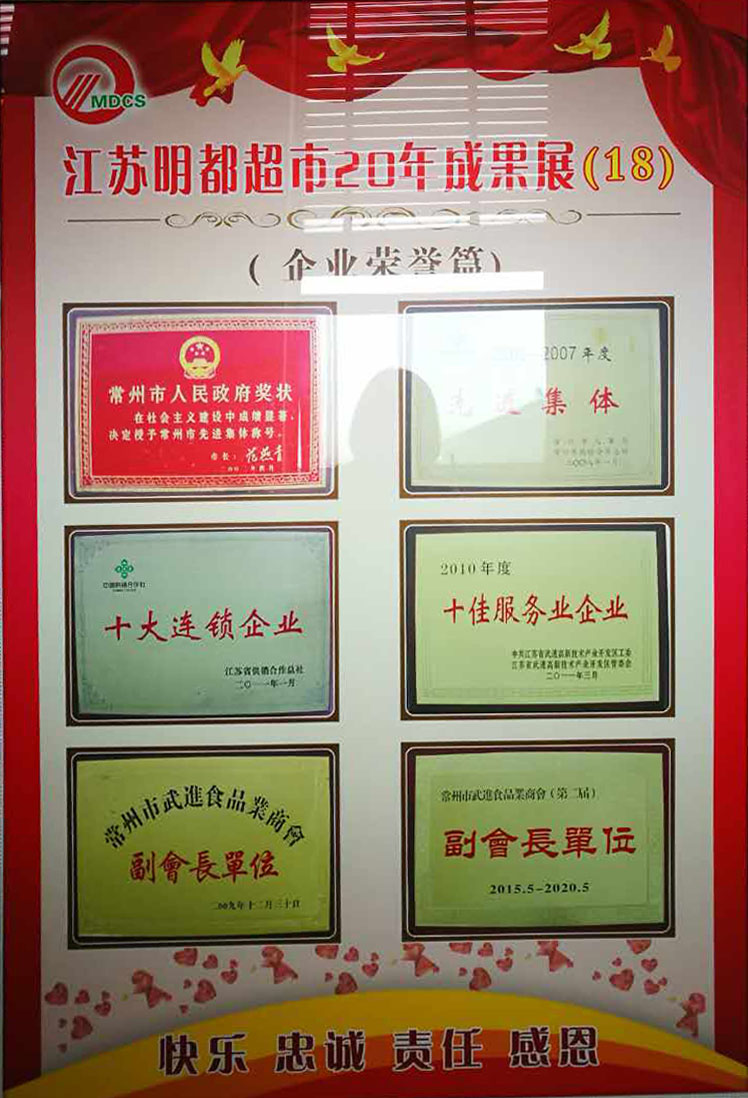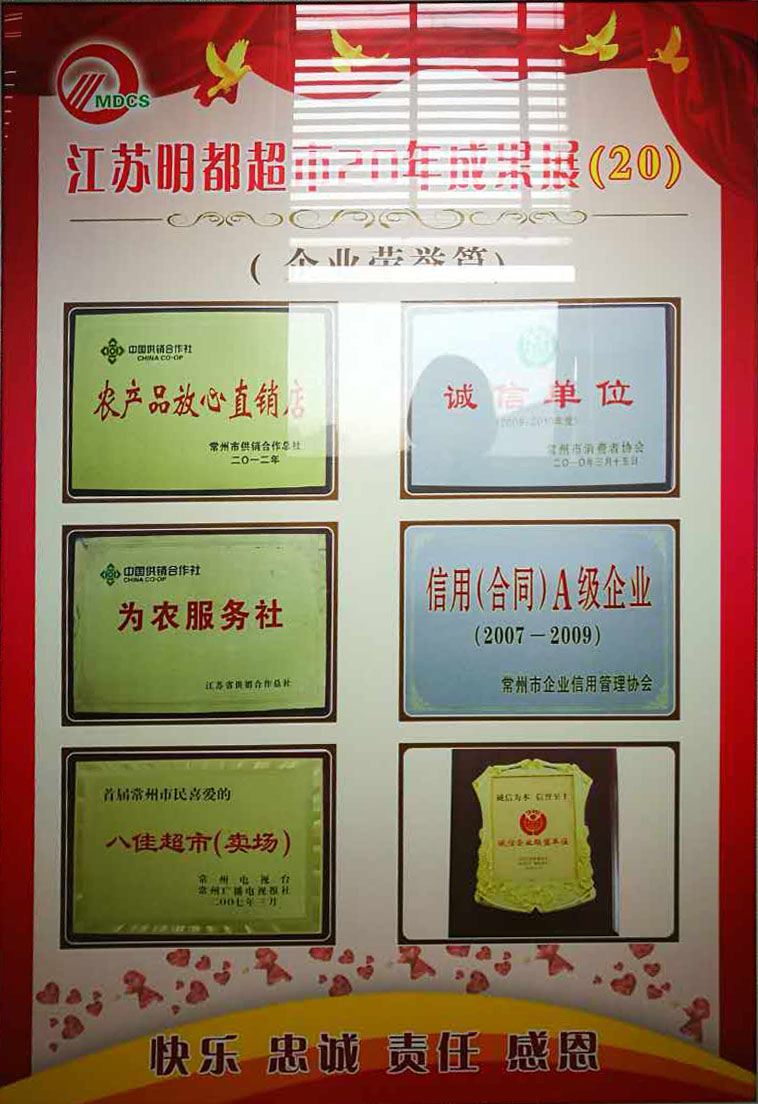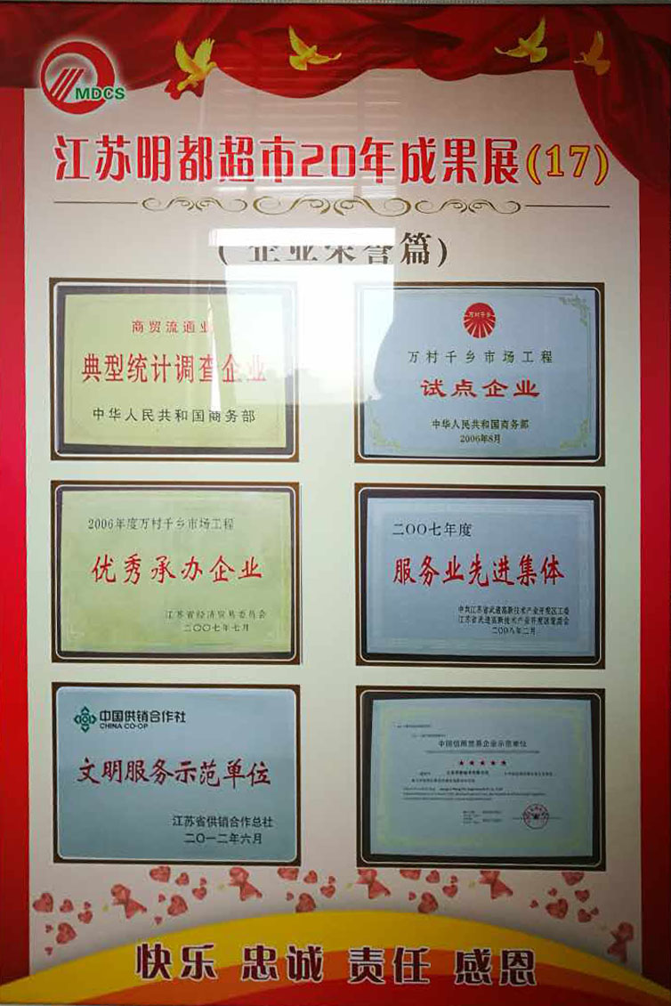 多年來,明都超市從單體商場運作到農村連鎖經營,從加盟品牌入手到自主創(chuàng)新品牌,成功實踐了立足農村、走進社區(qū)、輻射周邊的發(fā)展戰(zhàn)略,牢固確立了以百姓生活用品為主的連鎖經營業(yè)態(tài)。堅持為民服務方向,積極推進農超對接經銷各類農副產品。為了保持良好的發(fā)展勢頭,明都超市堅持“統一采購、統一配送、統一形象、統一核算、統一管理”的連鎖經營模式;以大批量、大面積、大規(guī)模直接從廠方進貨的方式,取得質優(yōu)價廉的商品;堅持“品質第一,追求卓越”的質量承諾;努力實踐“將更多的實惠讓給消費者”的價格方針;始終不渝地將“滿足消費者的需求”作為最終目標。在城鄉(xiāng)市場和廣大消費者心中樹立了良好的口碑和聲譽。多年來,公司取得了多項榮譽,先后被評為:武進區(qū)服務業(yè)先進單位,武進區(qū)十大流通服務先進企業(yè),區(qū)級納稅大戶。2006年—2007年獲得江蘇省供銷社、常州市供銷社系統先進集體、三星級為農服務社,2005年—2008價格A級誠信單位,消費、計量、質量誠信單位、文明單位,2007年—2010年信用(合同)A級企業(yè),2007年“百城萬店”無假貨示范店、市民評選八佳超市,2006年獲得國家商務部“萬村千鄉(xiāng)”市場工程試點企業(yè)及優(yōu)秀承辦企業(yè),2008年省放心消費者示范單位等多項榮譽稱號。