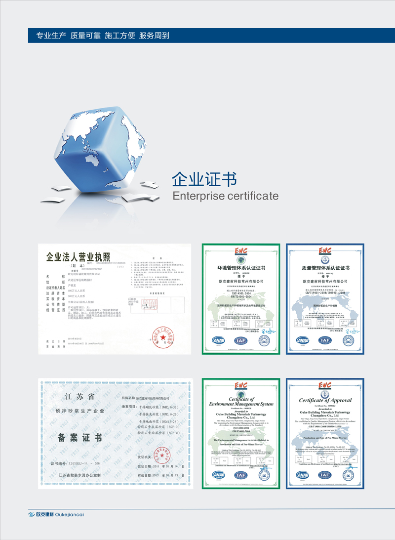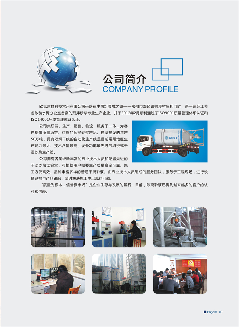 歐克建材科技常州有限公司坐落在中國燈具城之鎮(zhèn)——常州市鄒區(qū)鎮(zhèn)鶴溪村扁擔河畔,是一家經(jīng)江蘇省散裝水泥辦公室備案的預拌砂漿專業(yè)生產(chǎn)企業(yè)。并于2012年2月順利通過了ISO9001質(zhì)量管理體系認證和ISO14001環(huán)境管理體系認證。 公司集研發(fā)、生產(chǎn)、銷售、物流、服務于一體為客戶提供質(zhì)量穩(wěn)定、可靠的預拌砂漿產(chǎn)品。投資建設(shè)的年產(chǎn)50萬噸,具有雙烘干線的自動化生產(chǎn)線是目前常州地區(qū)生產(chǎn)能力最大、技術(shù)含量最高、設(shè)備功能最先進的塔樓式干混砂漿生產(chǎn)線。 公司擁有各類經(jīng)驗豐富的專業(yè)技術(shù)人員和配置先進的干混砂漿試驗室,可根據(jù)用戶需要生產(chǎn)質(zhì)量穩(wěn)定可靠、施工方便高效、品種豐富多樣的普通干混砂漿。由專業(yè)技術(shù)人員組成的服務團隊,服務于工程現(xiàn)場,進行設(shè)備巡檢與產(chǎn)品跟蹤,隨時解決施工中出現(xiàn)的問題。 “質(zhì)量為根本,信譽贏市場”是企業(yè)生存與發(fā)展的基石。目前,歐克砂漿已得到越來越多的客戶的認可和信賴。