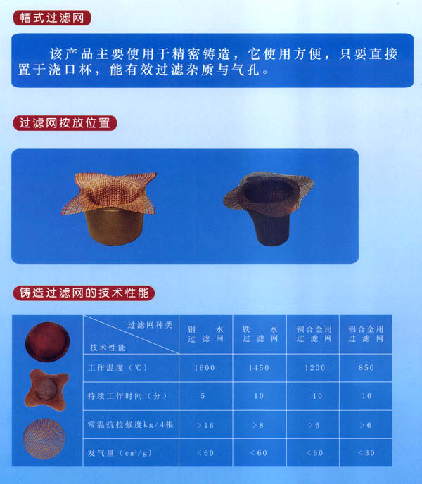 常州市猛將過濾網(wǎng)有限公司是專業(yè)生產(chǎn)系列鑄造過濾網(wǎng)的廠家。主要產(chǎn)品有:鐵水過濾網(wǎng)、鋼水過濾網(wǎng)、銅水過濾網(wǎng)、鋁水過濾網(wǎng)及熔模用帽式過濾網(wǎng)等。本廠產(chǎn)品是哈工大科研成果,榮獲國家經(jīng)委頒發(fā)的新技術(shù)成果獎。航天部科技進(jìn)步一等獎;中國質(zhì)量檢驗(yàn)協(xié)會授予“猛將”牌高硅氧過濾網(wǎng)“國家權(quán)威檢測達(dá)標(biāo)產(chǎn)品”榮譽(yù)證書;我廠生產(chǎn)的“四角帽式過濾網(wǎng)”獲國家專利局外觀設(shè)計(jì)專利證書;并獲香港國際新技術(shù)新產(chǎn)品博覽會“金獎證書”。2002年獲亞洲國際新技術(shù)新產(chǎn)品博覽會“科技發(fā)明進(jìn)步獎”,2002年本廠所生產(chǎn)的“四角帽式過濾網(wǎng)在首屆“金艦杯”國際新技術(shù)成果網(wǎng)絡(luò)交易會活動中成績顯著,被評為金杯獎。同年在日內(nèi)瓦國際專利技術(shù)成果博覽會中被評為國際優(yōu)秀專利金獎。目前,本廠產(chǎn)品銷往全國各省、市、自治區(qū),是國內(nèi)銷量最大的廠家之一。同時出口韓國、泰國、東南亞等國家。進(jìn)入21世紀(jì)以來,我國加入WTO后,我廠在哈工大葉榮茂教授的指導(dǎo)下,開發(fā)研制出一種多孔泡沫陶瓷過濾網(wǎng),該產(chǎn)品兼具玻璃纖維過濾網(wǎng)和直孔過濾網(wǎng)的篩分夾渣功能,且更具有吸附微小夾渣氧化物的功能。多孔泡沫陶瓷過濾網(wǎng)的主要工作原理是讓紊亂、翻騰的(TV urbuItnt Flow)金屬液經(jīng)過產(chǎn)品形成平穩(wěn)、均勻(SmoothFlow)的金屬液,金屬液經(jīng)過復(fù)雜的多孔泡沫陶瓷過濾網(wǎng),能有效地吸附截留微小氧化夾渣物,并溢除氣泡,然后能使鑄件產(chǎn)品達(dá)到純潔度高、強(qiáng)度高、韌性好、機(jī)械加工性能好等特點(diǎn),從而能夠降低生產(chǎn)成本,提高產(chǎn)品成品率,增加經(jīng)濟(jì)效益。我廠熱忱歡迎廣大用戶使用該產(chǎn)品。 我公司設(shè)計(jì)發(fā)明的“四角帽式過濾網(wǎng)”,已在2001年3月申請專利,并于當(dāng)年11月底經(jīng)中華人民共和國知識產(chǎn)權(quán)局授權(quán)公告。頒布了外觀設(shè)計(jì)專利證書,證書號第207620號。現(xiàn)有個別廠家悍然侵權(quán),公然在有關(guān)鑄造媒體打出侵權(quán)產(chǎn)品廣告。對此,我們鄭重聲明,要求侵權(quán)廠家盡快采取糾正措施,為了維護(hù)我們的知識產(chǎn)權(quán),我們不排除采取法律行動的可能。