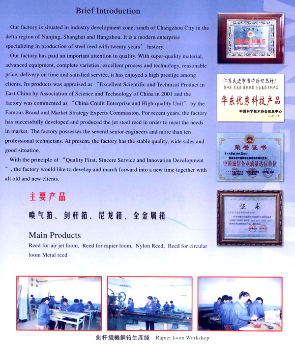 漕橋紡織器材廠位于常州市南郊寧、滬、杭金三角漕橋工業(yè)開發(fā)區(qū),是全國專業(yè)生產(chǎn)鋼筘規(guī)模較大的現(xiàn)代化廠家,已具有20年的歷史。 本廠生產(chǎn)的鋼筘有噴氣、劍桿筘、尼龍筘、圓織機筘和金屬筘分鉸筘、織帶筘、無梭織帶筘……本廠特別擅長生產(chǎn)高密度的劍桿筘。 本廠素以質(zhì)量為重,均采用優(yōu)質(zhì)材料制筘,如噴氣筘使用的筘片膠水鋁架等,均采用日本進口的材料;劍桿筘筘片采用日本進口的57B線材,膠水均采用紡織部定點的陜西紡織研究所生產(chǎn)的優(yōu)質(zhì)膠水、高密度劍桿筘均用進口膠水制筘;全金屬筘均用云南的優(yōu)質(zhì)錫制筘。 各種鋼筘筘面的平整度,筘齒的均勻度、垂直度,筘片的彈性度,膠水的牢固度廣大用戶使用后感到滿意放心,特別是使用壽命特別長,受到用戶一致的盛贊,真是料好筘好,筘好布好。 本廠為了使質(zhì)量精益求精,增添了不少先進設(shè)備,并聘請了數(shù)名高級工程師和十多位具有專業(yè)知識的技術(shù)人員把關(guān)。由于質(zhì)量穩(wěn)定可靠,2001年被中國科學(xué)技術(shù)協(xié)會評為“華東優(yōu)秀科技產(chǎn)品”二00二年被中國管理科學(xué)研究院名牌與市場戰(zhàn)略專家委員會評為“中國誠信企業(yè)質(zhì)量達標單位”。 今本廠產(chǎn)品暢銷全國20多個省市,價格優(yōu)惠,供不應(yīng)求,形勢喜人。 本廠本著“以質(zhì)取勝、誠信服務(wù)、創(chuàng)新發(fā)展”的宗旨,愿與廣大新老客戶攜手共肩,昂首走進新時代,迎接新的挑戰(zhàn)。