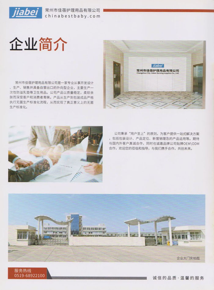 常州市佳蓓護理用品有限公司是一家專業(yè)從事開發(fā)、生產(chǎn)、銷售并具備自營出口的外向型企業(yè),主要生產(chǎn)“一次性防溢乳墊“,以質(zhì)量穩(wěn)定,柔軟親膚而深受客戶和消費者青睞。本公司產(chǎn)品從生產(chǎn)到包裝成品嚴格執(zhí)行無菌生產(chǎn)標準化流程,并和設(shè)備生產(chǎn)廠家合作開發(fā)了兩條從進料、生產(chǎn)、檢測、滅菌、成品包裝的無菌生產(chǎn)線,從而實現(xiàn)了真正意義上的無菌生產(chǎn)標準化。 佳蓓秉承”用戶至上“的原則,期待與國內(nèi)外客戶真誠合作,同時也誠邀品牌公司貼牌合作,歡迎您的蒞臨和指導(dǎo),與我們攜手合作,共創(chuàng)未來。