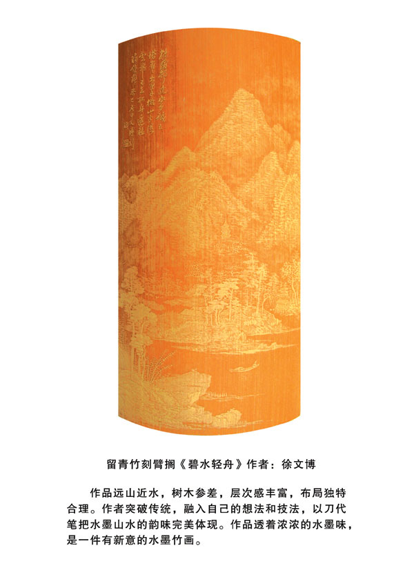 徐博(藝名文博),1973年生,江蘇武進(jìn)人,江蘇省省名人,高級(jí)工藝美術(shù)師,常州市留青竹刻非遺傳承人,常州工藝美術(shù)家協(xié)會(huì)理事,被譽(yù)為當(dāng)今中國(guó)最具創(chuàng)新意識(shí)的新銳竹刻家代表,多次獲得國(guó)家工藝美術(shù)大獎(jiǎng)。酷愛(ài)留青竹刻的徐文博賞竹為樂(lè),以竹詠志,借竹抒懷,悉心探索留青竹刻的藝術(shù)表現(xiàn)。在中國(guó)工藝美術(shù)大師蕭劍波的精心指導(dǎo)下,開(kāi)創(chuàng)留青水墨山水之技法,更好的體現(xiàn)了竹刻淡雅清秀的藝術(shù)風(fēng)格,并不斷汲取書(shū)畫(huà)、攝影、雕塑等藝術(shù)精華,不斷滋養(yǎng)藝術(shù)情趣,提升擴(kuò)展胸襟人格的同時(shí)也逐步形成了其形神兼?zhèn)洌搶?shí)相生,氣韻生動(dòng)的藝術(shù)特點(diǎn),作品為眾多的國(guó)內(nèi)外收藏家珍藏。