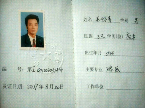 毛懷青,江蘇常州市武進(jìn)人。 中國(guó)工藝美術(shù)學(xué)會(huì)會(huì)員,常州市中國(guó)烙畫(huà)研究會(huì)副會(huì)長(zhǎng),常州市文博鑒賞協(xié)會(huì)理事,非物質(zhì)文化遺產(chǎn)烙畫(huà)傳承人。高級(jí)工藝美術(shù)師。 年輕時(shí)學(xué)習(xí)國(guó)畫(huà)、油畫(huà)中年蔓現(xiàn)掌州咯畫(huà)源遠(yuǎn)流長(zhǎng)、歷史悠久,有著其它美術(shù)門(mén)類(lèi)不具備的藝術(shù)風(fēng)格與特色?芍^是工藝美術(shù)中的一朵十分亮麗的藝術(shù)奇葩,是我民族先人給我們留下的一份不可多得十分珍貴的一份文化遺產(chǎn)。為弘揚(yáng)與發(fā)展這份優(yōu)秀文化遺產(chǎn),我從此下定決心研究烙畫(huà),愿付出一份力量為振興烙畫(huà)事業(yè)做出貢獻(xiàn)。至今已潛心研究幾十年,取得了可喜的成績(jī),被業(yè)界公認(rèn),社會(huì)關(guān)注與認(rèn)可。有“江南烙畫(huà)第一筆”之美譽(yù)。 近年來(lái),創(chuàng)作的烙畫(huà)作品分別獲得過(guò)全國(guó)、省市級(jí)的金、銀、銅獎(jiǎng)多次。中央電視臺(tái)曾兩次播放過(guò)本人的烙畫(huà)作品,江蘇電視臺(tái)、常州電視臺(tái)也曾多次播放過(guò)本人的作品與烙畫(huà)藝術(shù)生涯,揚(yáng)子晚報(bào)、常州日?qǐng)?bào)、常州晚報(bào)也曾多次報(bào)導(dǎo)過(guò)本人的烙畫(huà)作品,出版物有三種版本都能查閱到介紹本的烙畫(huà)從藝生涯與藝術(shù)業(yè)績(jī)。