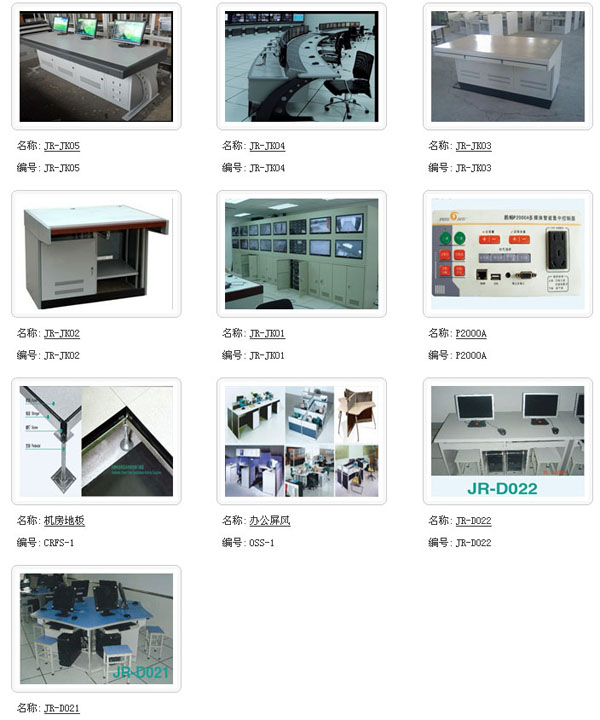 “久瑞”牌產(chǎn)品覆蓋:電子計算機、通訊網(wǎng)絡、公路交通、廣播電視、樓宇數(shù)控、電力輸配、教育設施、辦公設備。配套產(chǎn)品如監(jiān)控屏幕墻、控制操作臺、多媒體講臺、另外還有防靜電地板、屏風隔墻、文件柜、辦公桌、更衣室、工作臺、工具箱、貨架、實驗桌等。