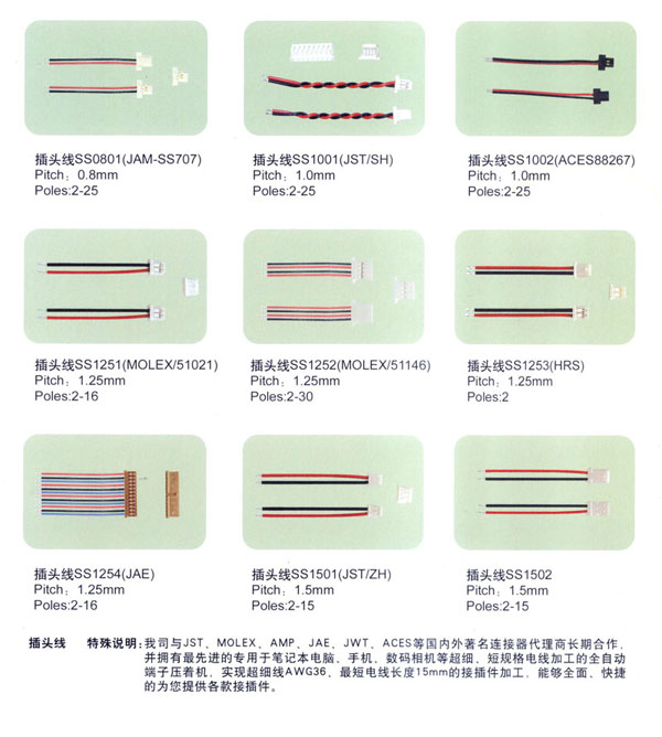 常州市匯創(chuàng)電子有限公司我公司2000年8月成立.端子連接線(xiàn)生產(chǎn)有10余年的經(jīng)驗(yàn).結(jié)合韓國(guó)連接線(xiàn)生產(chǎn)技術(shù),致力于筆記本電腦,手機(jī),數(shù)碼相機(jī)等高端行業(yè)的小間距的端子連接線(xiàn)的研究和生產(chǎn).小間距端子連接線(xiàn)的插頭的常規(guī)型號(hào)有 SH/1.0mm, 51021-0200/1.25mm, ZH , PH, EH, XH, SAN, SCN, 2510 等.特殊插頭型號(hào)有:02SUR-32S,02SSR-32H.材料用原廠(chǎng)進(jìn)口的JST, MOLEX,或臺(tái)資廠(chǎng)家的(根據(jù)客戶(hù)需要).全環(huán)保,無(wú)鉛化生產(chǎn).2008年開(kāi)始導(dǎo)入無(wú)鹵素要求。企業(yè)已經(jīng)通過(guò)ISO9001-2000質(zhì)量管理體系.質(zhì)量好!交貨快!價(jià)格合理!是目前常州AAC等多家大型受話(huà)器廠(chǎng)家的優(yōu)秀供應(yīng)商.客戶(hù)遍及常州周邊,蘇州,昆山,上海,深圳,嘉興,山東,重慶等地.也有直接出口韓國(guó),臺(tái)灣.現(xiàn)有高素質(zhì)員工100人左右.廠(chǎng)房面積2000平方米.