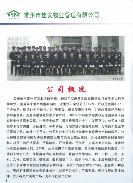 佳安物業(yè)管理有限公司位于常州市新北區(qū)薛家鎮(zhèn),2005年由薛家鎮(zhèn)黨委政府注冊成立,注冊資金50萬元,屬于三級資質(zhì)企業(yè)。成立之初,佳安物業(yè)作為政屬事業(yè)單位,主要負(fù)責(zé)管理薛家鎮(zhèn)順園新村安置小區(qū)。隨著薛家鎮(zhèn)經(jīng)濟(jì)和人口的發(fā)展,為主動適應(yīng)經(jīng)濟(jì)發(fā)展新常態(tài),全面深化物業(yè)綜合改革,打造具有薛家特色的物業(yè)公司,佳安物業(yè)由政府下屬的事業(yè)單位正式轉(zhuǎn)變?yōu)楠?dú)立運(yùn)營的企業(yè),并增資到1000萬元。 2017年6月,公司通過審核被評為“AAA”級信用企業(yè),同月,公司實(shí)施ISO9001質(zhì)量管理體系標(biāo)準(zhǔn),并于8月通過質(zhì)量體系認(rèn)證審核。2018年8月,公司通過了ISO14001環(huán)境管理體系、ohsas18001職業(yè)健康安全管理體系的認(rèn)證審核。 目前,公司主要承接小區(qū)物業(yè)服務(wù)及廠區(qū)外派保安服務(wù)、保潔服務(wù)等,F(xiàn)公司為薛家鎮(zhèn)順園一村至順園九村安置小區(qū)及奧林匹克花園、怡景名園2處商業(yè)小區(qū)提供物業(yè)服務(wù);為江南農(nóng)村商業(yè)銀行新北區(qū)所有支行、中車鐵馬、投資服務(wù)中心、華夏藝博園、薛家幼兒園、薛家小學(xué)及薛家中學(xué)等單位提供外派保安服務(wù);為薛家鎮(zhèn)中心廣場及松林別墅提供保安服務(wù);為華夏藝博園及投資服務(wù)中心提供保潔服務(wù)等。 在這十余年中,佳安物業(yè)與時(shí)俱進(jìn),銳意進(jìn)取,為地方建設(shè)發(fā)展注入動力,為居民和企業(yè)安全保駕護(hù)航,尤其是在實(shí)踐中,我們積極探索,正逐步摸索出一條適合薛家城鄉(xiāng)一體化建設(shè)的社區(qū)物業(yè)管理的新路。希望通過今天的分享,和大家一起探討我們在“管辦分離”等方面的實(shí)踐經(jīng)驗(yàn),并在此基礎(chǔ)上為薛家的可持續(xù)發(fā)展提供可借鑒、推廣的新型物業(yè)管理之路。