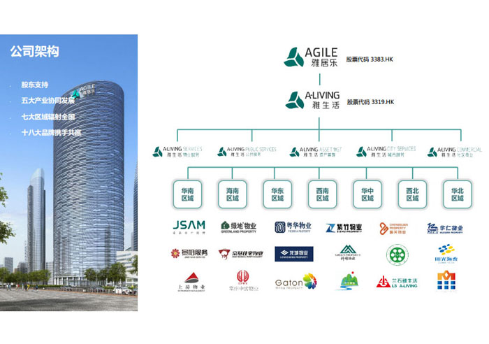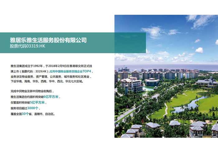 一、立足北上廣,面向全中國,走向全世界 1992年,雅居樂物業(yè)開篇中山,率先引入港式物業(yè)管理模式。1997年,依托雅居樂地產(chǎn)的崛起,連續(xù)接管中山多個項目,成為高端大盤物業(yè)管理的領(lǐng)跑者。1999年,雅居樂物業(yè)開啟專業(yè)化發(fā)展模式,全面通過英國皇家BSI的ISO9000質(zhì)量管理體系認(rèn)證,2001年成為國家首批一級物業(yè)管理資質(zhì)企業(yè)。 2002年,隨著廣州雅居樂花園的盛大啟幕,雅居樂物業(yè)邁開向廣州進(jìn)軍的步伐。為尋求更長遠(yuǎn)的發(fā)展,雅居樂積極構(gòu)思上市藍(lán)圖,2005年在香港成功上市。在深耕珠三角城市群的同時,2006年雅居樂物業(yè)揮師北上,正式開啟全國部署戰(zhàn)略。2008年,接管海南清水灣項目,揭開旅游地產(chǎn)物業(yè)管理的新篇章。 接下來近十年里,雅居樂物業(yè)始終保持著最年輕的成長姿態(tài),依托“管理數(shù)字化、服務(wù)專業(yè)化、流程標(biāo)準(zhǔn)化和操作機(jī)械化”的發(fā)展戰(zhàn)略,雅居樂物業(yè)榮膺2018中國物業(yè)服務(wù)百強(qiáng)企業(yè)第11名,2018年中國物業(yè)服務(wù)百強(qiáng)企業(yè)成長性第二名、2018年中國物業(yè)服務(wù)百強(qiáng)服務(wù)質(zhì)量領(lǐng)先企業(yè)、2018年中國物業(yè)服務(wù)百強(qiáng)滿意度領(lǐng)先企業(yè)、2018中國物業(yè)服務(wù)百強(qiáng)經(jīng)營績效領(lǐng)先企業(yè)、旅游地產(chǎn)物業(yè)管理領(lǐng)先品牌、2018年中國辦公物業(yè)管理優(yōu)秀企業(yè)(綠地物業(yè))、2017中國物業(yè)管理企業(yè)品牌價值第12名、2017中國物業(yè)管理企業(yè)綜合實力第12名、中國藍(lán)籌物業(yè)企業(yè)、《旅游地產(chǎn)物業(yè)管理服務(wù)標(biāo)準(zhǔn)》(團(tuán)體標(biāo)準(zhǔn))起草工作等多項殊榮。 目前,雅生活集團(tuán)已形成廣州、中山、深圳、南京、上海、西安、成都、海南、云南、北京、鄭州、南寧、沈陽、武漢、馬來西亞十五大城市公司全面發(fā)展的蓬勃態(tài)勢。截止2017年12月31日,雅生活集團(tuán)管理范圍覆蓋全國逾69座城市與地區(qū),服務(wù)類型涵蓋主流住宅、高端豪宅、旅游地產(chǎn)、商業(yè)、寫字樓等多種業(yè)態(tài),合約總建筑面積為12610萬平方米,擁有200多個項目,服務(wù)業(yè)主逾100萬人。 2017年6月,雅生活集團(tuán)收購綠地物業(yè)100%股權(quán),并與綠地集團(tuán)簽署戰(zhàn)略合作協(xié)議,8月,綠地集團(tuán)投資10億元獲得雅生活集團(tuán)20%股權(quán)。未來,雅生活集團(tuán)將實施“雅居樂物業(yè)”與“綠地物業(yè)”雙品牌驅(qū)動戰(zhàn)略,還將尋求在A股上市,力爭打造中國物業(yè)“A+H”第一股。