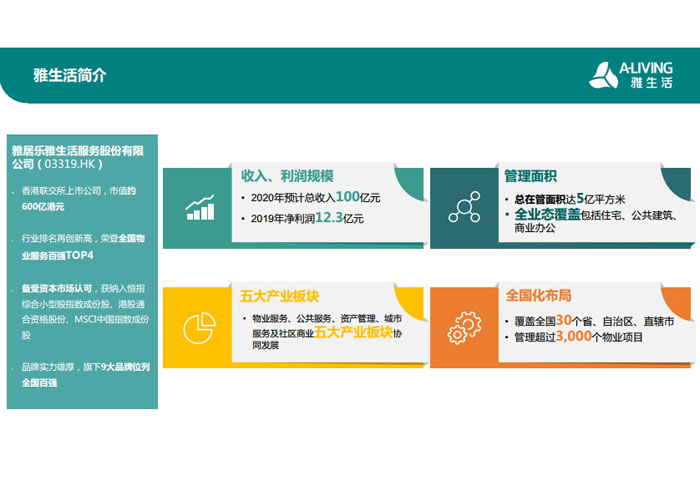 “人是雅居樂關(guān)注的核心,雅居樂不僅要蓋好房子,更希望全方位呵護(hù)業(yè)主的一生! 2015年,雅居樂集團(tuán)重新定義社區(qū)服務(wù)理念,以聯(lián)動發(fā)展模式,整合最優(yōu)質(zhì)的社區(qū)資源,為業(yè)主提供全面的居家生活解決方案。因此,雅居樂集團(tuán)“1+N”多元發(fā)展戰(zhàn)略規(guī)劃下的首個產(chǎn)業(yè)集團(tuán)——雅生活集團(tuán)應(yīng)運而生。目前雅生活集團(tuán)已集結(jié)物業(yè)、科技、旅游、廣告、營銷、驗房六大業(yè)務(wù)艦隊。2018年2月9日,雅生活集團(tuán)正式在香港聯(lián)合交易所主板掛牌上市(股票代碼03319.HK),成為中國首家紅籌分拆H股的物業(yè)服務(wù)企業(yè)。