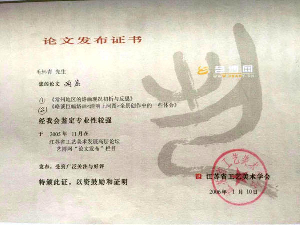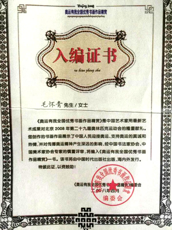 毛懷青,江蘇常州市武進人。 中國工藝美術(shù)學會會員,常州市中國烙畫研究會副會長,常州市文博鑒賞協(xié)會理事,非物質(zhì)文化遺產(chǎn)烙畫傳承人。高級工藝美術(shù)師。 年輕時學習國畫、油畫中年蔓現(xiàn)掌州咯畫源遠流長、歷史悠久,有著其它美術(shù)門類不具備的藝術(shù)風格與特色。可謂是工藝美術(shù)中的一朵十分亮麗的藝術(shù)奇葩,是我民族先人給我們留下的一份不可多得十分珍貴的一份文化遺產(chǎn)。為弘揚與發(fā)展這份優(yōu)秀文化遺產(chǎn),我從此下定決心研究烙畫,愿付出一份力量為振興烙畫事業(yè)做出貢獻。至今已潛心研究幾十年,取得了可喜的成績,被業(yè)界公認,社會關(guān)注與認可。有“江南烙畫第一筆”之美譽。 近年來,創(chuàng)作的烙畫作品分別獲得過全國、省市級的金、銀、銅獎多次。中央電視臺曾兩次播放過本人的烙畫作品,江蘇電視臺、常州電視臺也曾多次播放過本人的作品與烙畫藝術(shù)生涯,揚子晚報、常州日報、常州晚報也曾多次報導(dǎo)過本人的烙畫作品,出版物有三種版本都能查閱到介紹本的烙畫從藝生涯與藝術(shù)業(yè)績。