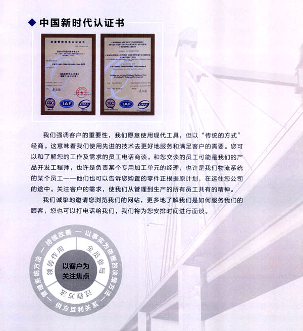 公司于2007年6月通過IS09001質(zhì)量體系認證。本著信譽第一,誠實合作,嚴格管理為服務宗旨,全員參與、持續(xù)改善。提升品質(zhì)、準時交貨、客戶滿意的質(zhì)量方針。為客戶提供優(yōu)質(zhì)的產(chǎn)品,周到的服務。嚴格的品質(zhì),快捷的送貨,完善的生產(chǎn)設備,一流的技術,使公司在同行業(yè)中占有一席之地。
