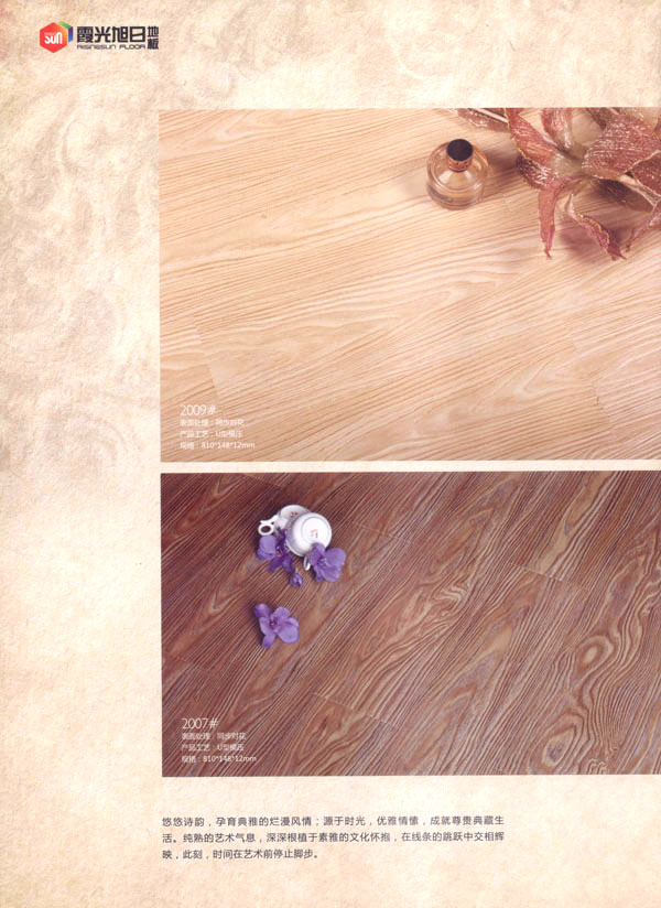 品牌保證,質(zhì)量放心 公司旗下“霞光.旭日”品牌地板系列由旭日皇家、旭日經(jīng)典、旭日戀家、至尊奢華、巧奪天工、水晶陶瓷等幾個系列構(gòu)成,配有專職質(zhì)量檢驗(yàn)人員,嚴(yán)把產(chǎn)品質(zhì)量關(guān),不斷完善產(chǎn)品質(zhì)量體系、監(jiān)控管理體系。公司對客戶需求全面、科學(xué)、準(zhǔn)確地把握,確保對客戶市場適時高效反應(yīng)。一流的設(shè)備、精心的選材、完美的工藝以及對產(chǎn)品品味不倦的追求,令奔公司產(chǎn)品獨(dú)樹一幟。