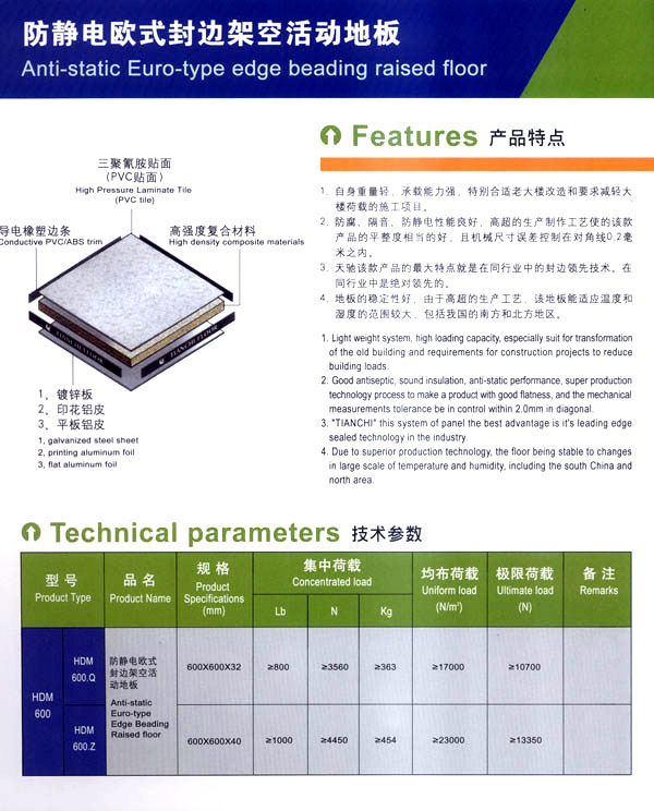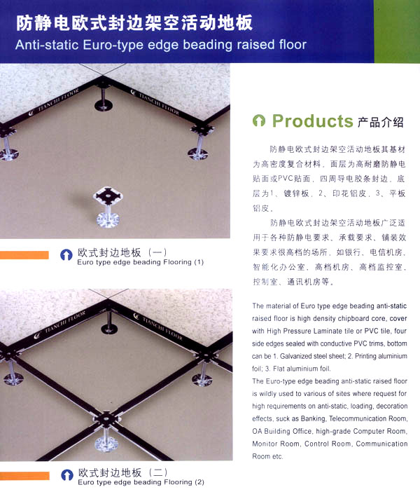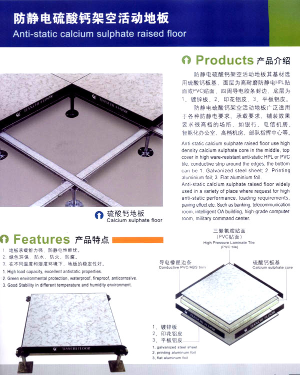 公司專業(yè)生產(chǎn)“天馳”系列活動(dòng)地板,符合國(guó)家安全要求,種類完備多樣,其中防靜電瓷質(zhì)高架通路地板除具有普通瓷質(zhì)的裝飾和實(shí)用性外,其耐磨,防水,防火功能優(yōu)于其他同類產(chǎn)品,深受客戶歡迎。