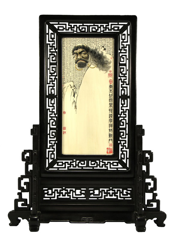 2牙刻《回眸》傳神的刻畫了達摩禪師回眸間投來的眼神,就像一位飽經(jīng)風(fēng)霜的老者,有幾經(jīng)坎坷的人生故事向你訴說,有多少世態(tài)炎涼人生哲理向你傳遞。回眸間風(fēng)中飄逸的須發(fā)、寬聳的鼻梁、緊鎖的眉頭,乃至畫面中作者極力奉獻給觀者的、達摩那炯炯有神的眼睛,像大海那么寬廣、像宇宙那么深遂。畫面背景銘刻達摩相關(guān)禪的精辟論著,更顯佛的天國,禪的意境。幾枚大小相間的朱紅印章散發(fā)幾分文雅氣息。人物的須發(fā)看似瀟灑的筆墨一揮而就,其實借助放大鏡看去烏黑發(fā)亮、密密層層的須發(fā)根根可數(shù)、飄逸迷人。既突出筆墨與刀法,又凸顯內(nèi)涵與精神,是作者勤于雕刻而又修煉于雕刻之外的結(jié)晶。 此作獲首屆中國華東工藝美術(shù)精品展特等金獎,為中國工藝美術(shù)館珍藏。