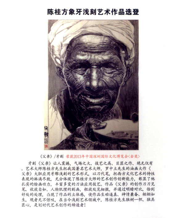 陳桂方,江蘇常州武進人,中國著名雕刻藝術(shù)家,江蘇省工藝美術(shù)大師、研究員級、高級工藝美術(shù)師,江蘇省非物質(zhì)文化遺產(chǎn)《象牙淺刻》代表性傳承人。畢業(yè)于中國書畫函授大學(xué),深造于清華大學(xué)、南大美術(shù)系,現(xiàn)任中國工藝美術(shù)協(xié)會會員,江蘇省工藝美術(shù)學(xué)會理事,常州市工藝美術(shù)家協(xié)會副秘書長,常州市工藝美術(shù)行業(yè)協(xié)會常務(wù)理事,武進工藝美術(shù)協(xié)會副主席。陳桂方大師淺刻作品的藝術(shù)特點:山水氣韻生動,氣勢磅礴,場面壯觀,刀法細膩:人物仕女生動可人,栩栩如生,充分表達體現(xiàn)了中國象牙工藝獨具的內(nèi)在文化底蘊和現(xiàn)代社會的審美觀念及獨特的淺刻藝術(shù)表現(xiàn)技藝。對每件藝術(shù)作品創(chuàng)作都精益求精,強調(diào)藝術(shù)創(chuàng)作的思想性、意境及內(nèi)涵。注重章法構(gòu)思,掌握牙刻藝術(shù)的特性表現(xiàn),作品具有鮮明生動的時代氣息,獨具所創(chuàng)工筆與寫意相結(jié)合的牙刻藝術(shù)表現(xiàn)手法和表現(xiàn)形式,出眾、飄逸、多變的刀法技藝,粗獷處見細微、方寸間見大觀的創(chuàng)作理念深受專家權(quán)威的肯定和業(yè)內(nèi)人士的一致好評。陳桂方大師至企頑事象牙淺刻藝術(shù)創(chuàng)作近四十余載,完善了自己的創(chuàng)作體系,成就了自己獨特的藝術(shù)風(fēng)格。作品數(shù)年來連續(xù)二十多次榮獲國家最高藝術(shù)精品大獎《金獎》,象牙淺刻作品《李逵探母》已被國家工藝美術(shù)館收藏,并頒發(fā)了國家收藏證書,在全國數(shù)十年間尚屬首次。當前,陳桂方牙刻藝術(shù)作品已深受廣大海內(nèi)外業(yè)內(nèi)人士、收藏家們的鐘愛、青睞、熱藏,并被譽為當代最杰出最具潛質(zhì)的實力派藝術(shù)大師。