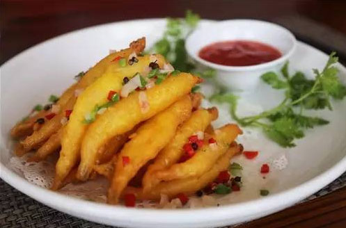 椒鹽大銀魚(yú) 從張總口中得知,原來(lái)太湖銀魚(yú)約有4種,眼前這道菜選用的就是個(gè)頭最大的銀魚(yú),也叫柴魚(yú)。只是簡(jiǎn)單地裹了面粉下鍋油炸,撒上點(diǎn)自配椒鹽料,酸甜汁作輔。盤中堆成“金色小山”看著美,聞著香,吃著鮮。區(qū)別于上一道菜,對(duì)這盤銀魚(yú)你大可放開(kāi)了吃,一口一個(gè),體驗(yàn)脆香表皮中肥美的滋味在口中迸發(fā),絕對(duì)是極致的享受。