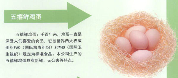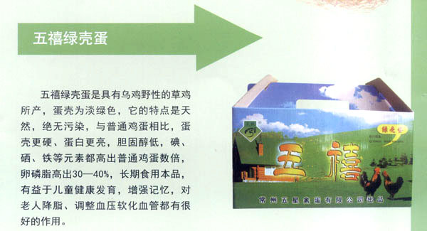 常州五星禽蛋有限公司創(chuàng)建于1990年,是常州市最大的禽蛋生產(chǎn)基地。公司秉承“辦實事、服務(wù)城市;上水平,掙創(chuàng)效益”的經(jīng)營宗旨。注重科技開發(fā)與管理創(chuàng)新,全力打造“五禧”品牌。公司于2000年通過了ISO9002質(zhì)量體系認證;2004年又通過了無公害雞蛋產(chǎn)地和產(chǎn)品認證,并獲兩項專利。 經(jīng)多年努力實現(xiàn)了“五禧”產(chǎn)品系列化,F(xiàn)公司每年向市場提供有“五禧”鮮雞蛋,“五禧”土雞蛋,“五禧”ELC蛋,“五禧”綠殼草雞蛋,成為了不同消費群體的理想選擇!拔屐钡岸啻螛s獲常州市場知名商標(biāo)稱號。