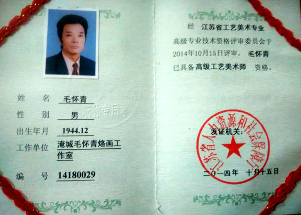 毛懷青,江蘇常州市武進人。 中國工藝美術學會會員,常州市中國烙畫研究會副會長,常州市文博鑒賞協(xié)會理事,非物質文化遺產烙畫傳承人。高級工藝美術師。 年輕時學習國畫、油畫中年蔓現(xiàn)掌州咯畫源遠流長、歷史悠久,有著其它美術門類不具備的藝術風格與特色?芍^是工藝美術中的一朵十分亮麗的藝術奇葩,是我民族先人給我們留下的一份不可多得十分珍貴的一份文化遺產。為弘揚與發(fā)展這份優(yōu)秀文化遺產,我從此下定決心研究烙畫,愿付出一份力量為振興烙畫事業(yè)做出貢獻。至今已潛心研究幾十年,取得了可喜的成績,被業(yè)界公認,社會關注與認可。有“江南烙畫第一筆”之美譽。 近年來,創(chuàng)作的烙畫作品分別獲得過全國、省市級的金、銀、銅獎多次。中央電視臺曾兩次播放過本人的烙畫作品,江蘇電視臺、常州電視臺也曾多次播放過本人的作品與烙畫藝術生涯,揚子晚報、常州日報、常州晚報也曾多次報導過本人的烙畫作品,出版物有三種版本都能查閱到介紹本的烙畫從藝生涯與藝術業(yè)績。