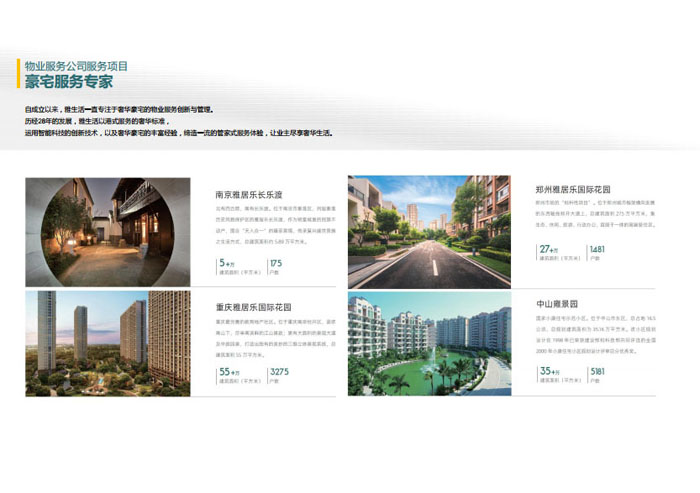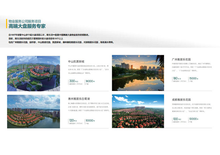一、立足北上廣,面向全中國,走向全世界 1992年,雅居樂物業(yè)開篇中山,率先引入港式物業(yè)管理模式。1997年,依托雅居樂地產的崛起,連續(xù)接管中山多個項目,成為高端大盤物業(yè)管理的領跑者。1999年,雅居樂物業(yè)開啟專業(yè)化發(fā)展模式,全面通過英國皇家BSI的ISO9000質量管理體系認證,2001年成為國家首批一級物業(yè)管理資質企業(yè)。 2002年,隨著廣州雅居樂花園的盛大啟幕,雅居樂物業(yè)邁開向廣州進軍的步伐。為尋求更長遠的發(fā)展,雅居樂積極構思上市藍圖,2005年在香港成功上市。在深耕珠三角城市群的同時,2006年雅居樂物業(yè)揮師北上,正式開啟全國部署戰(zhàn)略。2008年,接管海南清水灣項目,揭開旅游地產物業(yè)管理的新篇章。 接下來近十年里,雅居樂物業(yè)始終保持著最年輕的成長姿態(tài),依托“管理數(shù)字化、服務專業(yè)化、流程標準化和操作機械化”的發(fā)展戰(zhàn)略,雅居樂物業(yè)榮膺2018中國物業(yè)服務百強企業(yè)第11名,2018年中國物業(yè)服務百強企業(yè)成長性第二名、2018年中國物業(yè)服務百強服務質量領先企業(yè)、2018年中國物業(yè)服務百強滿意度領先企業(yè)、2018中國物業(yè)服務百強經營績效領先企業(yè)、旅游地產物業(yè)管理領先品牌、2018年中國辦公物業(yè)管理優(yōu)秀企業(yè)(綠地物業(yè))、2017中國物業(yè)管理企業(yè)品牌價值第12名、2017中國物業(yè)管理企業(yè)綜合實力第12名、中國藍籌物業(yè)企業(yè)、《旅游地產物業(yè)管理服務標準》(團體標準)起草工作等多項殊榮。 目前,雅生活集團已形成廣州、中山、深圳、南京、上海、西安、成都、海南、云南、北京、鄭州、南寧、沈陽、武漢、馬來西亞十五大城市公司全面發(fā)展的蓬勃態(tài)勢。截止2017年12月31日,雅生活集團管理范圍覆蓋全國逾69座城市與地區(qū),服務類型涵蓋主流住宅、高端豪宅、旅游地產、商業(yè)、寫字樓等多種業(yè)態(tài),合約總建筑面積為12610萬平方米,擁有200多個項目,服務業(yè)主逾100萬人。 2017年6月,雅生活集團收購綠地物業(yè)100%股權,并與綠地集團簽署戰(zhàn)略合作協(xié)議,8月,綠地集團投資10億元獲得雅生活集團20%股權。未來,雅生活集團將實施“雅居樂物業(yè)”與“綠地物業(yè)”雙品牌驅動戰(zhàn)略,還將尋求在A股上市,力爭打造中國物業(yè)“A+H”第一股。