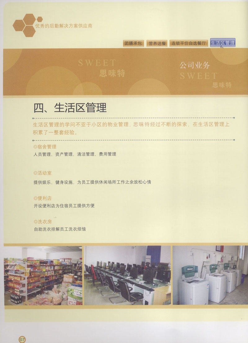 常州市思味特餐飲有限公司是一家專業(yè)從事企事業(yè)后勤服務(wù)的有限責(zé)任公司,公司從承包食堂起步,逐漸發(fā)展為經(jīng)營團膳承包、營養(yǎng)送餐、生活區(qū)管理、連鎖餐廳的綜合型企業(yè)。2008年公司斥資100萬元,在常州興建了可以同時提供3000餐膳食的中央廚房,重點打造“和美客”后勤服務(wù)品牌,全力為企事業(yè)單位解決后勤后顧之憂。 到目前為止,我們合作成功的企事業(yè)單位超過50多家,服務(wù)人數(shù)突破15萬,合作單位包括國家機關(guān)、國有企業(yè)、三資企業(yè)、民營企業(yè)、學(xué)校、醫(yī)院等,其中不乏國際知名品牌公司。 和美客愿為更多的國內(nèi)外企事業(yè)單位及機關(guān)團體分憂解難,從廚房設(shè)計、菜品配送、團膳承包、到生活區(qū)管理等提供全方位的服務(wù)。