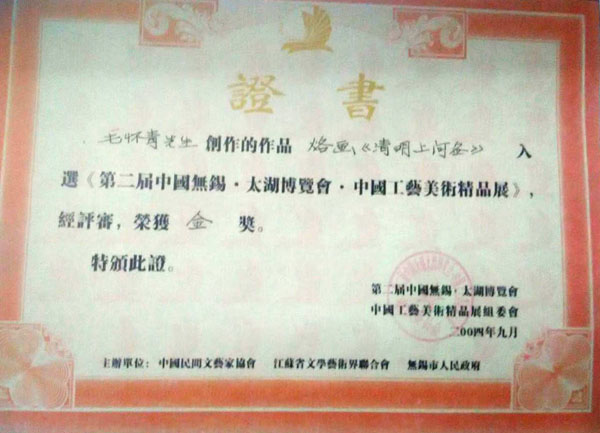 毛懷青,江蘇常州市武進(jìn)人。 中國(guó)工藝美術(shù)學(xué)會(huì)會(huì)員,常州市中國(guó)烙畫(huà)研究會(huì)副會(huì)長(zhǎng),常州市文博鑒賞協(xié)會(huì)理事,非物質(zhì)文化遺產(chǎn)烙畫(huà)傳承人。高級(jí)工藝美術(shù)師。 年輕時(shí)學(xué)習(xí)國(guó)畫(huà)、油畫(huà)中年蔓現(xiàn)掌州咯畫(huà)源遠(yuǎn)流長(zhǎng)、歷史悠久,有著其它美術(shù)門(mén)類不具備的藝術(shù)風(fēng)格與特色?芍^是工藝美術(shù)中的一朵十分亮麗的藝術(shù)奇葩,是我民族先人給我們留下的一份不可多得十分珍貴的一份文化遺產(chǎn)。為弘揚(yáng)與發(fā)展這份優(yōu)秀文化遺產(chǎn),我從此下定決心研究烙畫(huà),愿付出一份力量為振興烙畫(huà)事業(yè)做出貢獻(xiàn)。至今已潛心研究幾十年,取得了可喜的成績(jī),被業(yè)界公認(rèn),社會(huì)關(guān)注與認(rèn)可。有“江南烙畫(huà)第一筆”之美譽(yù)。 近年來(lái),創(chuàng)作的烙畫(huà)作品分別獲得過(guò)全國(guó)、省市級(jí)的金、銀、銅獎(jiǎng)多次。中央電視臺(tái)曾兩次播放過(guò)本人的烙畫(huà)作品,江蘇電視臺(tái)、常州電視臺(tái)也曾多次播放過(guò)本人的作品與烙畫(huà)藝術(shù)生涯,揚(yáng)子晚報(bào)、常州日?qǐng)?bào)、常州晚報(bào)也曾多次報(bào)導(dǎo)過(guò)本人的烙畫(huà)作品,出版物有三種版本都能查閱到介紹本的烙畫(huà)從藝生涯與藝術(shù)業(yè)績(jī)。