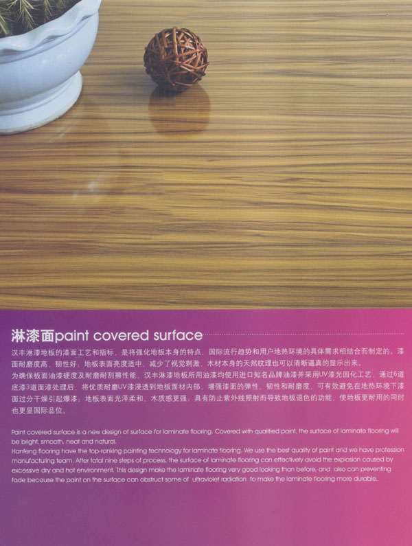 常州漢豐裝飾材料有限公司是一家涉及強化地板制造、屏風(fēng)鋁材生產(chǎn)、進(jìn)出口貿(mào)易的大型公司。2001年公司投入重資.全面引進(jìn)世界頂級一體化自動流水生產(chǎn)線和具有國際先進(jìn)水準(zhǔn)的德國權(quán)威木地板生產(chǎn)技術(shù),興建強化地板生產(chǎn)基地。多年以來.一直不斷加強生產(chǎn)設(shè)備、廠房基礎(chǔ)投入,目前公司年生產(chǎn)強化地板能力已經(jīng)達(dá)到了500萬平方米,步入國內(nèi)一流行列,具備了雄厚的國際競爭力。 漢豐地板以奉獻(xiàn)生活中最完美的地板為發(fā)展目標(biāo),時尚流行的設(shè)計風(fēng)格和多樣化的產(chǎn)品類型,贏得了市場的廣泛贊譽和肯定。產(chǎn)品嚴(yán)格按照歐洲標(biāo)準(zhǔn)檢測強化木地板的各項性能指標(biāo).達(dá)到百分百的國際技術(shù)標(biāo)準(zhǔn),確保了每一塊地板都有著上乘品質(zhì),是綠色環(huán)保的好地板。并先后通過了Isc)9001國際質(zhì)量管理體系認(rèn)證,IS014001國際環(huán)境管理體系認(rèn)證.中國環(huán)境標(biāo)志產(chǎn)品認(rèn)證,深得用戶的一致好評,是寫字樓、商場、大型超市、學(xué)校、建筑樓宇、娛樂場所、家用私宅等鋪裝的首選地板。