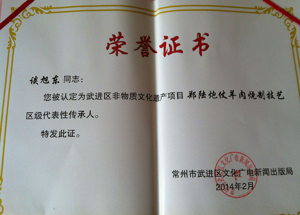 談家的羊肉館位于鄭陸老街上,深秋的一天,記者來(lái)到這家羊肉館,穿過(guò)大堂走到廚房里,幾名工人正在忙著處理羊肉。余菊華穿著大紅色的薄毛衣,坐在桌子旁,正在麻利地剔著羊肉上的肥油。她是羊肉館的老一代老板娘,如今和老伴談仲興一起,仍天天來(lái)店里幫著兒子談旭東打下手。余阿姨隨手拿過(guò)一塊長(zhǎng)方形的肉皮,用一把小刮刀撳在上面,輕輕地刮著,一團(tuán)團(tuán)白白的油被剔了下來(lái),堆在一邊!拔壹业难蛉馀酶蓛舻,腿上的肥肉還有筋筋拉拉的東西,全都要弄掉,就是自己家買(mǎi)了豬肉燒紅燒肉,也不可能弄到這么干凈的,F(xiàn)在的客人都怕胖,所以一定要處理得干干凈凈!庇喟⒁陶f(shuō)。剔好的肉皮是用來(lái)熬成皮凍然后混和著羊肉壓制成羊糕的,只有清理得干凈,沒(méi)有一點(diǎn)雜質(zhì),羊糕的質(zhì)量才會(huì)好。