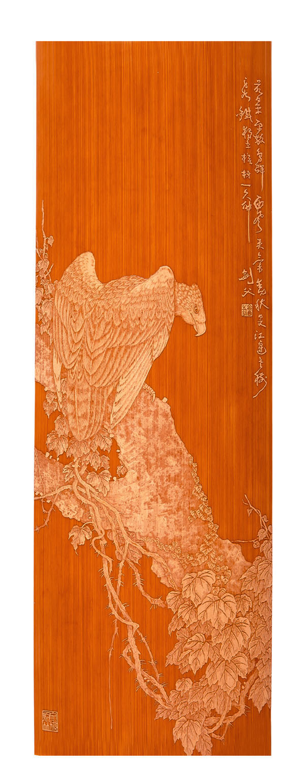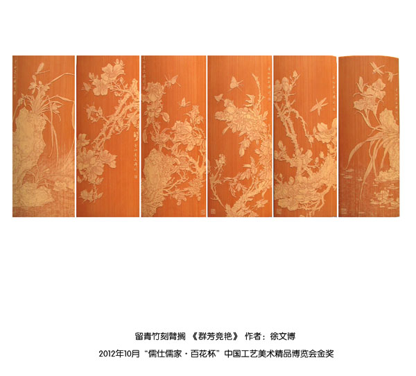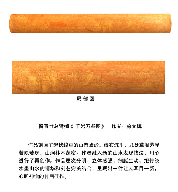 徐博(藝名文博),1973年生,江蘇武進人,江蘇省省名人,高級工藝美術師,常州市留青竹刻非遺傳承人,常州工藝美術家協會理事,被譽為當今中國最具創(chuàng)新意識的新銳竹刻家代表,多次獲得國家工藝美術大獎?釔哿羟嘀窨痰男煳牟┵p竹為樂,以竹詠志,借竹抒懷,悉心探索留青竹刻的藝術表現。在中國工藝美術大師蕭劍波的精心指導下,開創(chuàng)留青水墨山水之技法,更好的體現了竹刻淡雅清秀的藝術風格,并不斷汲取書畫、攝影、雕塑等藝術精華,不斷滋養(yǎng)藝術情趣,提升擴展胸襟人格的同時也逐步形成了其形神兼?zhèn),虛實相生,氣韻生動的藝術特點,作品為眾多的國內外收藏家珍藏。