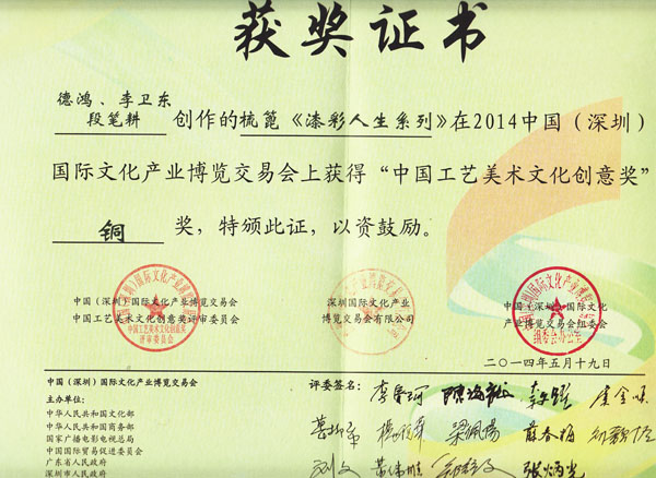公司榮譽(yù)介紹: “2009年常州市旅游商品創(chuàng)新設(shè)計大賽”,“覽盡千荷”綠檀雕刻梳榮獲三等獎; “2011年常州市旅游商品創(chuàng)新設(shè)計大賽”,“彩印工藝梳-我們的年代(80)”榮獲二等獎。 “2011年中國包裝創(chuàng)意設(shè)計大賽“,虞美人彩印梳篦系列包裝獲得一等獎; “2011年中國包裝創(chuàng)意設(shè)計大賽”,虞美人筷子系列包裝獲得三等獎; “2011創(chuàng)意中國.第五屆設(shè)計藝術(shù)大獎賽”,虞美人系列包裝獲得三等獎; “2011首屆中國(無錫)國際文化藝術(shù)博覽會”,漆藝對梳《喜玫瑰》獲得“藝博杯“銅獎。 “第十三屆中國工藝美術(shù)大師作品暨國際藝術(shù)精品博覽會”, 漆藝梳《報喜鳥》榮獲2012“儒士儒家•百花杯”中國工藝美術(shù)精品獎優(yōu)秀獎 “第十三屆中國工藝美術(shù)大師作品暨國際藝術(shù)精品博覽會”, 虞美人《渾然天成》榮獲2012“儒士儒家•百花杯”中國工藝美術(shù)精品獎金獎 “2012江蘇省工藝美術(shù)精品大獎賽”,虞美人《S型梳》喜獲“藝博杯”銀獎 “第十四屆中國工藝美術(shù)大師作品暨國際藝術(shù)精品博覽會”, 虞美人工藝梳《新型十二星座梳》榮獲2013“國信•百花杯”中國工藝美術(shù)精品獎優(yōu)秀獎 “2013【藝博杯】江蘇省工藝美術(shù)精品大獎賽”,虞美人《萬事如意系列》喜獲“藝博杯”銀獎 “2013江蘇省工藝美術(shù)新人新作成果展作品大獎賽”,虞美人《壺(福)的藝術(shù)》喜獲“藝博杯”入圍獎 2013年度江蘇省“蘇商領(lǐng)袖峰會”,常州市卓尚飾品有限公司榮獲最具成長性企業(yè)獎 常州市卓尚飾品(虞美人)有限公司總經(jīng)理李衛(wèi)東榮獲“常州創(chuàng)意產(chǎn)業(yè)協(xié)會2013年底慈善獎榮譽(yù)” 常州市卓尚飾品有限公司榮獲薛家鎮(zhèn)人民政府2013年度“創(chuàng)新創(chuàng)優(yōu)”獎 常州市卓尚飾品有限公司榮獲薛家鎮(zhèn)人民政府2013年度“銷售業(yè)績”獎 2014中國(深圳)國際文化產(chǎn)業(yè)博覽交易會,劉燕西、李衛(wèi)東、段筆耕<十二星座系列>獲得“中國工藝美術(shù)文化創(chuàng)意獎”銀獎 2014中國(深圳)國際文化產(chǎn)業(yè)博覽交易會,徐德鴻、李衛(wèi)東、段筆耕《漆彩人生系列》獲得“中國工藝美術(shù)文化創(chuàng)意獎”銅獎 文化創(chuàng)意大獎賽“紫金獎” ,有余(魚)系列梳篦產(chǎn)品獲得了優(yōu)秀獎 2014吟飛杯首屆常州文化創(chuàng)意和設(shè)計大賽,虞美人有余(魚)系列梳篦產(chǎn)品榮獲優(yōu)秀設(shè)計獎 2014吟飛杯首屆常州文化創(chuàng)意和設(shè)計大賽,虞美人“云,月”系列梳篦產(chǎn)品榮獲優(yōu)秀設(shè)計獎 2014藝博杯江蘇省工藝美術(shù)精品大獎賽,虞美人《梳篦:酒醉的探戈》喜獲銀獎 2014“中國原創(chuàng)•百花杯”中國工藝美術(shù)精品大獎賽,虞美人《梳篦-江南風(fēng)韻系列》喜獲銀獎 常州市卓尚飾品有限公司獲“2014年常州市電子商務(wù)協(xié)會2014年度優(yōu)秀會員單位” 2014“虞美人”成為常州市知名商標(biāo)。