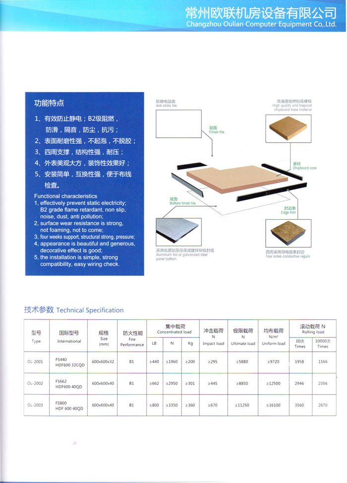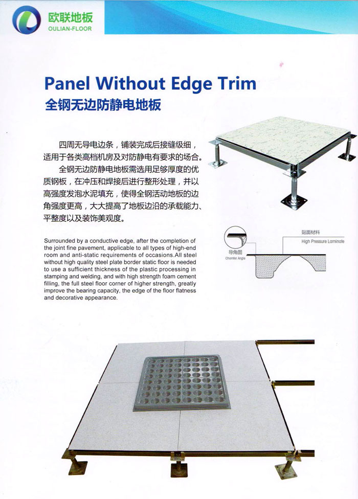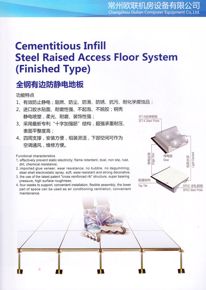 “歐聯(lián)”系列全鋼地板,符合國家安全要求,種類完備多樣,其中防靜電陶瓷地板、硫酸鈣地板等除具有普通瓷質(zhì)的裝飾和實(shí)用性外,其耐磨、防水、防火功能優(yōu)于其它同類產(chǎn)品,防靜電系列地板,能切合不同客戶的要求,其靈活的配置,深受客戶歡迎,不同材質(zhì)的地板結(jié)構(gòu)使設(shè)計(jì)師的設(shè)計(jì)空間比傳統(tǒng)的更加廣闊自由和善變。