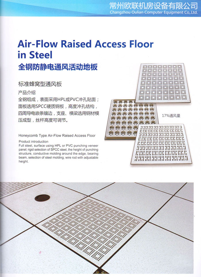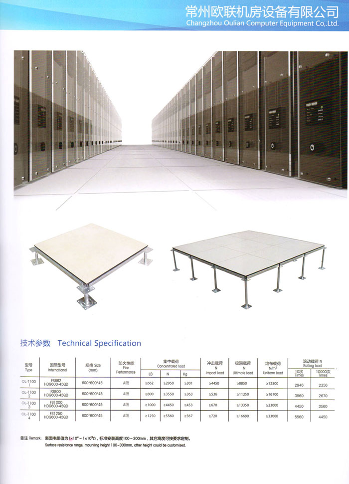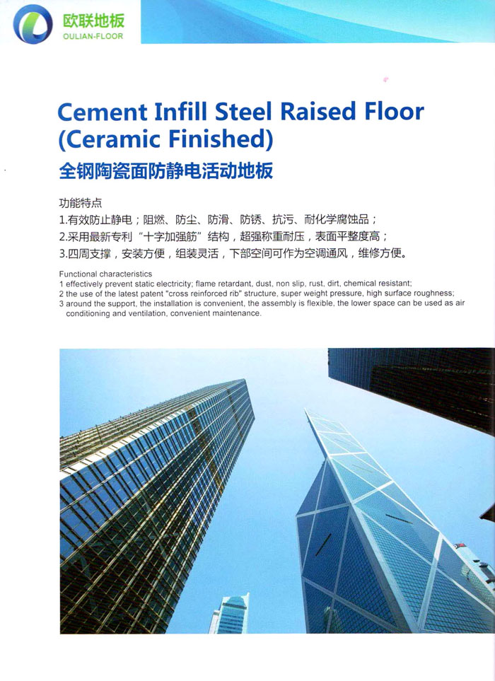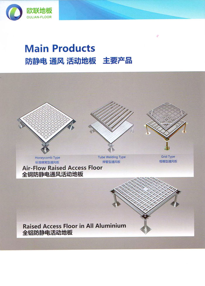防靜電高架活動(dòng)地板、全鋼地板、陶瓷地板是計(jì)算機(jī)行業(yè)發(fā)展起來的新型鋪地材料,隔離了潮氣、靜電灰塵,最重要的是解決了綜合布線問題,無需預(yù)埋管線,可隨時(shí)拆卸、搬移,保證了資訊設(shè)備完整的優(yōu)點(diǎn),適應(yīng)了智能化樓宇中信息自動(dòng)化技術(shù)對所處環(huán)境的特定要求,避免了廣大客戶的雙重投資,使現(xiàn)代化辦公程度更加高效,辦公場所更加舒適。 “歐聯(lián)”系列全鋼地板,符合國家安全要求,種類完備多樣,其中防靜電陶瓷地板、硫酸鈣地板等除具有普通瓷質(zhì)的裝飾和實(shí)用性外,其耐磨、防水、防火功能優(yōu)于其它同類產(chǎn)品,防靜電系列地板,能切合不同客戶的要求,其靈活的配置,深受客戶歡迎,不同材質(zhì)的地板結(jié)構(gòu)使設(shè)計(jì)師的設(shè)計(jì)空間比傳統(tǒng)的更加廣闊自由和善變。 公司大力發(fā)展國內(nèi)外銷售業(yè)務(wù),多次中標(biāo)國內(nèi)重點(diǎn)工程 ,例:哈爾濱醫(yī)科大學(xué)、山東大學(xué)、上海普通機(jī)場等。 公司將一如既往開發(fā)和制造一流的產(chǎn)品,愿與廣大有識之士合作發(fā)展,共創(chuàng)美好未來。