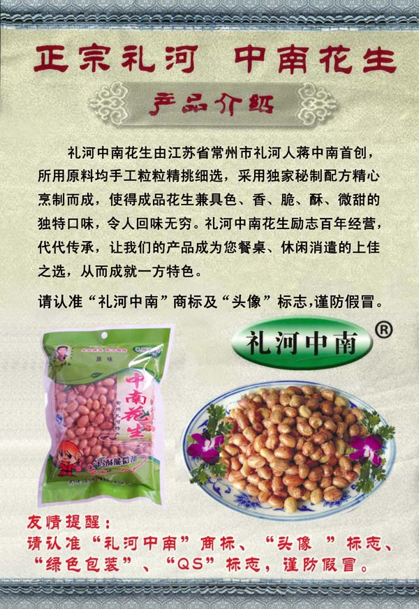 武進區(qū)牛塘中南食品廠的是由原“禮河中南”花生發(fā)展而成。"禮河中南"花生由常州禮河人蔣中南首創(chuàng)。所采用的花生,選用優(yōu)質(zhì)的產(chǎn)地,經(jīng)過人工精心挑選,把不規(guī)則的粒子去掉,加上獨家的配方和精工制作,使花生香、酥、脆、微甜。獨特的口味,令人吃了回味無窮,在常武地區(qū)享有盛譽、暢銷不衰。 隨著“禮河中南“花生在常武地區(qū)的暢銷,企業(yè)不斷的發(fā)展壯大,逐漸發(fā)展成為一個專業(yè)生產(chǎn)加工油炸花生的公司,擁有完整、科學(xué)的質(zhì)量管理體系。武進牛塘中南花生食品廠設(shè)備齊全、環(huán)境干凈整潔、資質(zhì)齊全,企業(yè)的誠信、實力和產(chǎn)品質(zhì)量獲得業(yè)界的認可。 正宗的中南花生為綠色包裝,包裝上有“禮河中南”花生創(chuàng)始人蔣中南先生的頭像以及QS生產(chǎn)許可標志,請廣大客戶認準購買,以防假冒。 歡迎各界朋友蒞臨參觀、指導(dǎo)和業(yè)務(wù)洽談。 制造商:常州市武進區(qū)牛塘中南食品廠 銷售店:常州市武進區(qū)禮河聚新家園商業(yè)街12-8號 常州市武進區(qū)湖塘鎮(zhèn)東方路53號(陸家橋西側(cè))