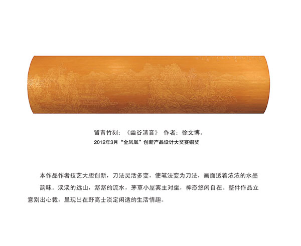 徐博(藝名文博),1973年生,江蘇武進人,江蘇省省名人,高級工藝美術(shù)師,常州市留青竹刻非遺傳承人,常州工藝美術(shù)家協(xié)會理事,被譽為當今中國最具創(chuàng)新意識的新銳竹刻家代表,多次獲得國家工藝美術(shù)大獎?釔哿羟嘀窨痰男煳牟┵p竹為樂,以竹詠志,借竹抒懷,悉心探索留青竹刻的藝術(shù)表現(xiàn)。在中國工藝美術(shù)大師蕭劍波的精心指導(dǎo)下,開創(chuàng)留青水墨山水之技法,更好的體現(xiàn)了竹刻淡雅清秀的藝術(shù)風格,并不斷汲取書畫、攝影、雕塑等藝術(shù)精華,不斷滋養(yǎng)藝術(shù)情趣,提升擴展胸襟人格的同時也逐步形成了其形神兼?zhèn),虛實相生,氣韻生動的藝術(shù)特點,作品為眾多的國內(nèi)外收藏家珍藏。