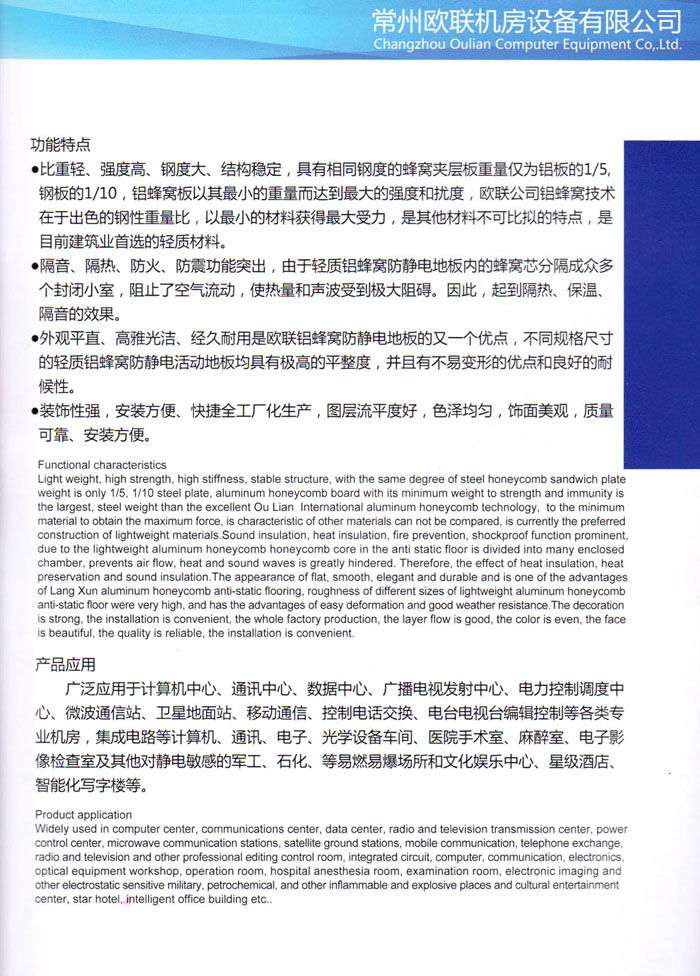 防靜電高架活動地板、全鋼地板、陶瓷地板是計算機行業(yè)發(fā)展起來的新型鋪地材料,隔離了潮氣、靜電灰塵,最重要的是解決了綜合布線問題,無需預(yù)埋管線,可隨時拆卸、搬移,保證了資訊設(shè)備完整的優(yōu)點,適應(yīng)了智能化樓宇中信息自動化技術(shù)對所處環(huán)境的特定要求,避免了廣大客戶的雙重投資,使現(xiàn)代化辦公程度更加高效,辦公場所更加舒適。 “歐聯(lián)”系列全鋼地板,符合國家安全要求,種類完備多樣,其中防靜電陶瓷地板、硫酸鈣地板等除具有普通瓷質(zhì)的裝飾和實用性外,其耐磨、防水、防火功能優(yōu)于其它同類產(chǎn)品,防靜電系列地板,能切合不同客戶的要求,其靈活的配置,深受客戶歡迎,不同材質(zhì)的地板結(jié)構(gòu)使設(shè)計師的設(shè)計空間比傳統(tǒng)的更加廣闊自由和善變。 公司大力發(fā)展國內(nèi)外銷售業(yè)務(wù),多次中標(biāo)國內(nèi)重點工程 ,例:哈爾濱醫(yī)科大學(xué)、山東大學(xué)、上海普通機場等。 公司將一如既往開發(fā)和制造一流的產(chǎn)品,愿與廣大有識之士合作發(fā)展,共創(chuàng)美好未來。