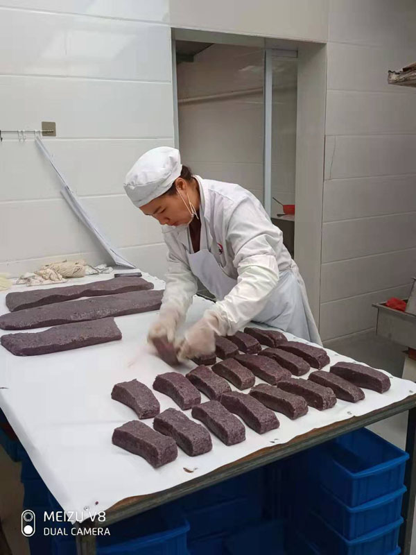 腳踏糕本名“年糕”,按常州周邊地區(qū)的風(fēng)俗習(xí)慣,在春季前夕,各家各戶(hù)都要蒸年糕,吃年糕!案狻敝C音“高”,過(guò)年吃年糕被賜予“年年高”,一年高一年,鋒吉祥之意,表達(dá)這人們對(duì)未來(lái)美好生活的憧憬和良好的祝愿。今天小編要帶大家的就是一家至今保持著傳統(tǒng)手工制作的鈺鋒糕點(diǎn)坊。 鈺鋒糕點(diǎn)坊位于常州鄭陸鎮(zhèn)三皇廟范家莊,一個(gè)比較偏僻的村莊,雖然這家作坊不大,但香糯絲滑,軟糯適中,韌勁十足的腳踏糕吸引了無(wú)數(shù)的食客。制作一條腳踏糕要從淘米,浸泡,碾粉,鋪粉,一層一層的鋪下去,需要無(wú)數(shù)道制作工序,這些都是店主孫煥公公老周,憑著幾十年的經(jīng)驗(yàn),加上店主孫煥從不馬虎的決心! 這“腳踏”也并非赤腳上陣,而是把蒸好的糕倒入早以準(zhǔn)備好的框子里,用布包裹好,上面再用薄膜包好,再蓋上布,再換上專(zhuān)門(mén)腳踏的布鞋,踩的時(shí)候要?jiǎng)蚍Q(chēng),左右腳要配合好,不然糕會(huì)高高低低,不平整,最后再拿蠟燭線拆成一條小長(zhǎng)條,再拿帶包裝好,如此又香又糯的腳踏糕就大功告成了。 店主孫煥為了讓更多的人認(rèn)識(shí)和了解常州腳踏糕的傳統(tǒng)文化和美食,她在傳統(tǒng)工藝中增加了適合現(xiàn)代文化的多種口味,她在糕里加入南瓜,紫薯,老紅糖,大麥汁,血糯米,核桃,葡萄干,紅棗等食材,做出五顏六色,純天然的口味,深受食客們的喜愛(ài),不管是送人還是自己吃都非常新穎。 (重陽(yáng)糕)重陽(yáng)糕的由來(lái),九九重陽(yáng),九是陽(yáng)數(shù),也是陽(yáng)數(shù)中最大的數(shù),九月初九,兩九相重,為之重陽(yáng),古人有重陽(yáng)登高的習(xí)俗。高于糕同意,寓意人活九十九,生活步步高,秋景勝春光,夕陽(yáng)無(wú)限好。夕陽(yáng)紅成了老人對(duì)自己美好的祝愿和希望,所以從某種意義上來(lái)講它“祝壽糕”“長(zhǎng)壽糕”重陽(yáng)糕在常州地區(qū)是家喻戶(hù)曉的,下面小編帶你去一家至今保持傳統(tǒng)手工制作的鈺鋒糕點(diǎn)坊看一下吧。鈺鋒糕點(diǎn)坊位于常州市天寧區(qū)鄭陸鎮(zhèn)三皇廟范家莊,偏僻的小村莊,雖然有點(diǎn)偏僻,但是每到重陽(yáng)節(jié)到來(lái),每天還是有很多食客來(lái)訂購(gòu)和購(gòu)買(mǎi)店主孫煥做的多種口味的重陽(yáng)糕。要想做出松軟香糯的重陽(yáng)糕,原材料和糯米和梗米的配比也很重要,調(diào)整好比例開(kāi)始淘米,浸泡,釓粉,放入糖攪拌,篩粉,糕底部放上荷葉,中間的餡心都是孫煥自己熬制,口感,香糯松軟,店主孫煥為了吸引更多現(xiàn)代年輕人,她在粉里加入南瓜,紫薯,紅糖,血糯等,色彩搭配很出跳,吸引來(lái)了很多食客,孫煥2019年開(kāi)始自愿捐贈(zèng)重陽(yáng)糕給敬老院,她說(shuō)這樣的公益活動(dòng)自己很喜歡,雖然金額不大,缺表達(dá)了她的一份心意,并稱(chēng)這樣的公益活動(dòng)她每年都會(huì)做。