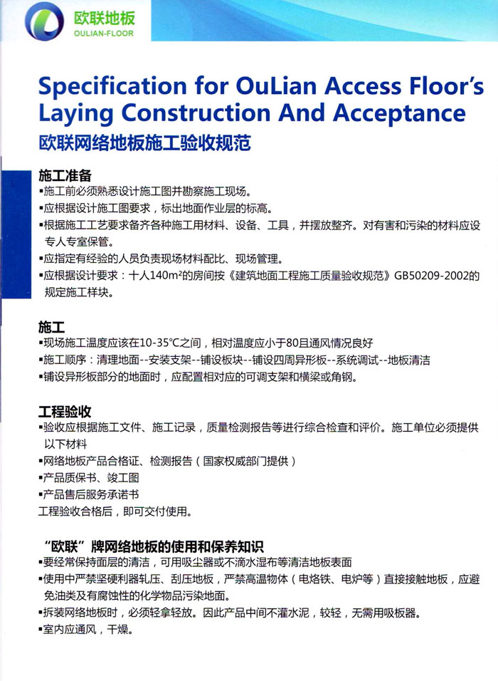 防靜電高架活動(dòng)地板、全鋼地板、陶瓷地板是計(jì)算機(jī)行業(yè)發(fā)展起來的新型鋪地材料,隔離了潮氣、靜電灰塵,最重要的是解決了綜合布線問題,無需預(yù)埋管線,可隨時(shí)拆卸、搬移,保證了資訊設(shè)備完整的優(yōu)點(diǎn),適應(yīng)了智能化樓宇中信息自動(dòng)化技術(shù)對(duì)所處環(huán)境的特定要求,避免了廣大客戶的雙重投資,使現(xiàn)代化辦公程度更加高效,辦公場(chǎng)所更加舒適。 “歐聯(lián)”系列全鋼地板,符合國(guó)家安全要求,種類完備多樣,其中防靜電陶瓷地板、硫酸鈣地板等除具有普通瓷質(zhì)的裝飾和實(shí)用性外,其耐磨、防水、防火功能優(yōu)于其它同類產(chǎn)品,防靜電系列地板,能切合不同客戶的要求,其靈活的配置,深受客戶歡迎,不同材質(zhì)的地板結(jié)構(gòu)使設(shè)計(jì)師的設(shè)計(jì)空間比傳統(tǒng)的更加廣闊自由和善變。 公司大力發(fā)展國(guó)內(nèi)外銷售業(yè)務(wù),多次中標(biāo)國(guó)內(nèi)重點(diǎn)工程 ,例:哈爾濱醫(yī)科大學(xué)、山東大學(xué)、上海普通機(jī)場(chǎng)等。 公司將一如既往開發(fā)和制造一流的產(chǎn)品,愿與廣大有識(shí)之士合作發(fā)展,共創(chuàng)美好未來。
